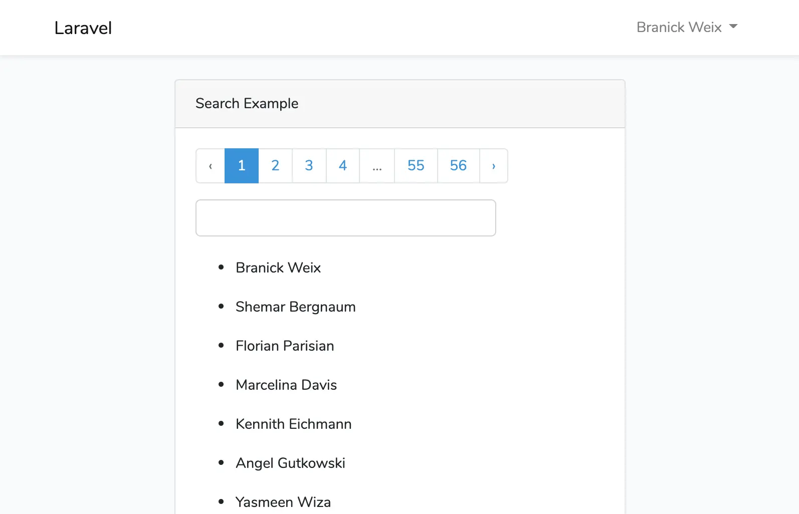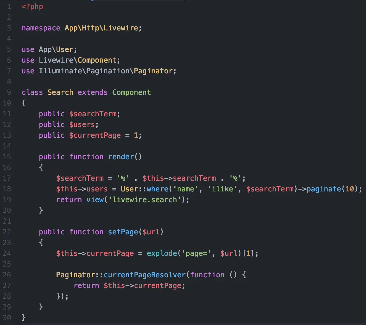 首先,添加默认分页链接 {{$users->onEachSide(1)->links()}}到search.blade.php来显示分页。 为了使用 Eloquent 分页, 则需要更新查询语句为: $this->users = User::where('name', 'ilike', $searchTerm)->paginate(10);
