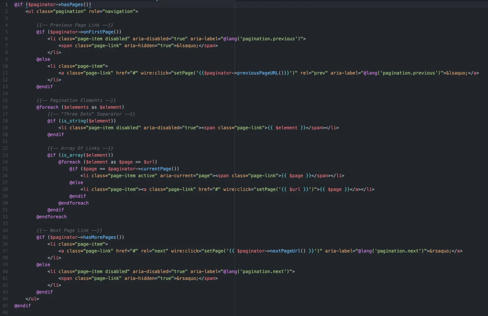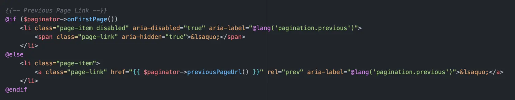 与其构建一个全新的分页系统,不如使用默认的分页系统并使用新的 Livewire 功能对其进行修改。可以在 resources/views/vendor/pagination/找到默认的 Bootstrap 分页 作为 bootstrap-4.blade.php。我们可以看到每个按钮和页码都是设置为上一个或下一个URL的链接: