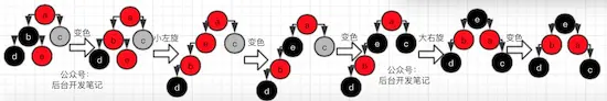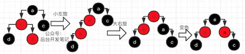 //情况五:左子节点黑,右子节点双重黑,左子节点的右子节点红(LR型):左子节点变红,左子节点左旋,左子节点变黑,右子节点变黑,大右旋,左节点颜色=右节点