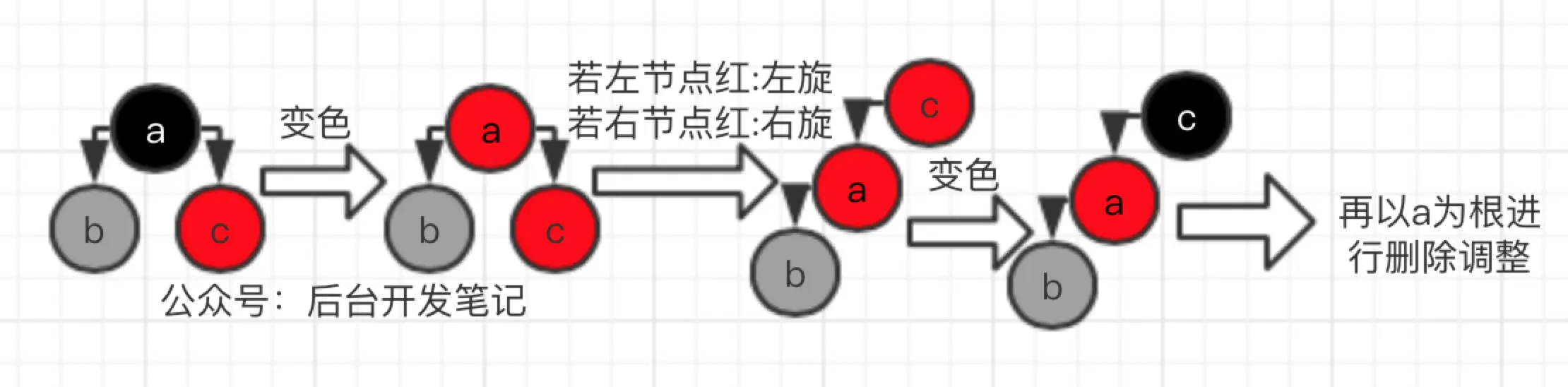 //情况二:子节点一个双重黑,一个红:先自身变红,若左节点红则右旋,右节点红则左旋,最后自身变黑