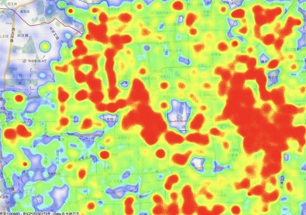 结果如下,可以看出中间位置的故宫、五环西北角的圆明园、颐和园均没有单车,热力图大体是正确的。