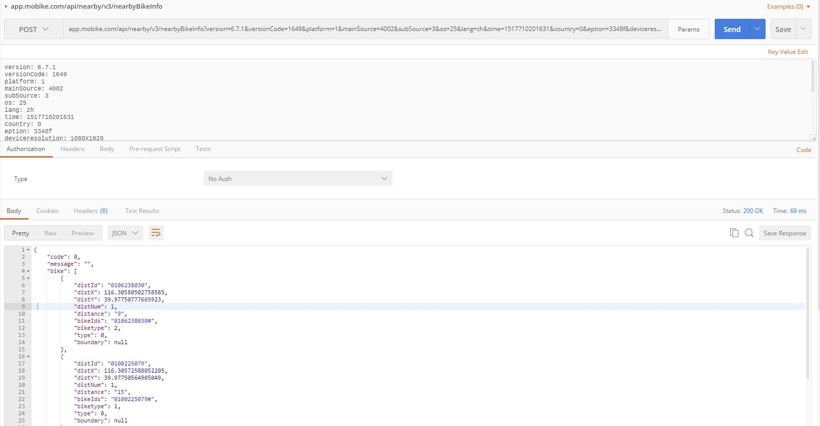 发现 header 有很多参数,甚至还有 time 和 utctime 两个时间参数。摩拜会存取每个时刻单车的静态信息吗?显然不会,这样的存储成本太高了,通过程序验证确实是这样。对于其它参数,也可以自行验证。
