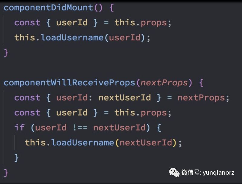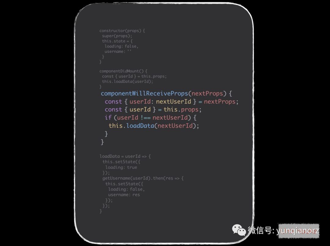再比如,我们要写一个请求用户信息的组件,当userId 变化时,要重新发起请求。我们就要在两个生命中期中写请求的逻辑。