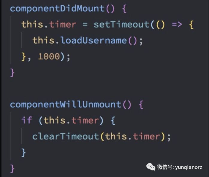 比如,如果你有个定时器,你一定要在 componentWillUnMount 去卸载。