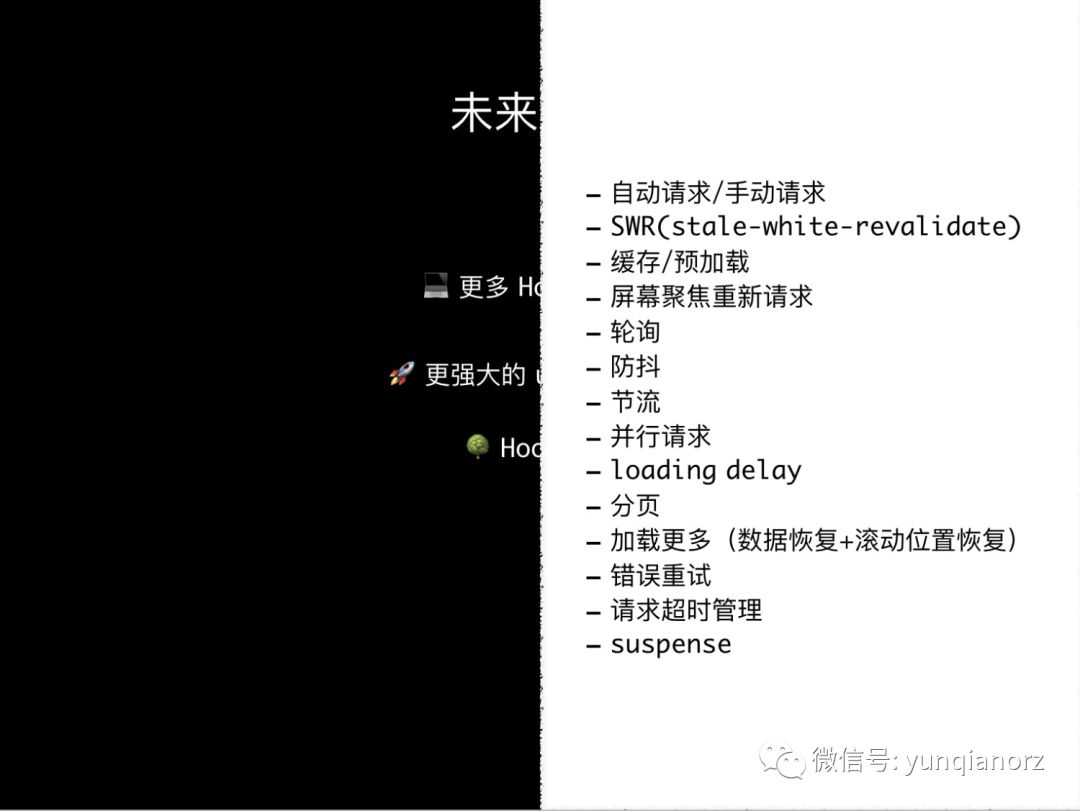 大家应该都听过 useSWR 吧?是 zeit 公司开发的一个专门做网络请求的 Hooks,提供了很多新颖的思路,给了我们非常大的启发,github star 就像坐火箭一样。但在实际项目使用中,还是会有很多地方不符合蚂蚁内部的体系。但是它给我们非常大的启发,基于 swr 的思路,我们可以实现更强大的 useRequest!图上的能力,我们都要!