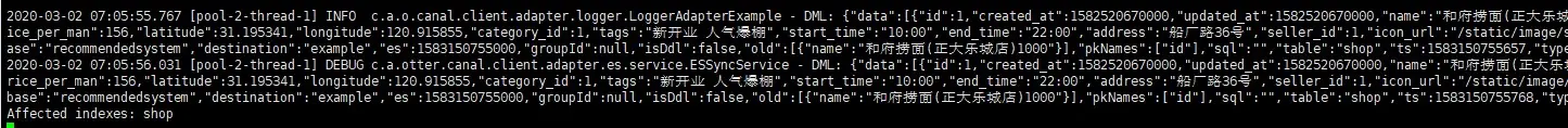# 修改 mysql 数组库中的内容,可以看到 adapter.log 日志近乎同时打印出来了所修改的内容