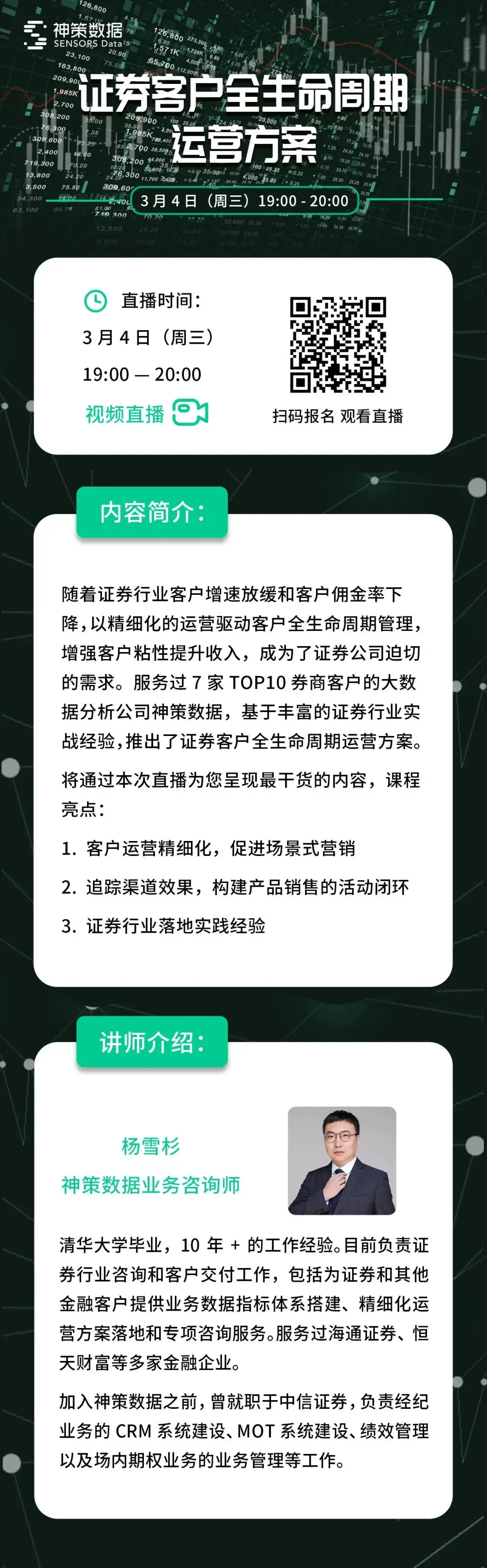仅剩 2 天 | 《证券客户全生命周期运营方案》直播,相约周三! 神策数据 2020-03-02 174 阅读1分钟 点击 注册和登录 | 神策数据 | Sensors Data - 国内领先的用户行为分析产品,免费体验证券 demo