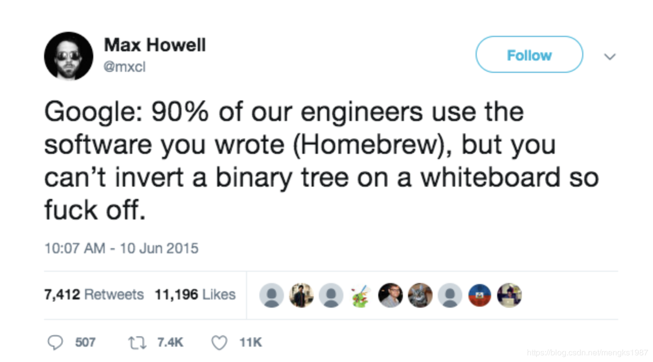 除非你做出了非一般的成就,他们会因为没有录取你而感到惋惜。不知道大家记不记得 Max Howell,这位就是发明Homebrew 的大神,这位牛人曾经就因为一个算法问题而被Google拒绝,让我们来看一看是多么复杂的算法题: