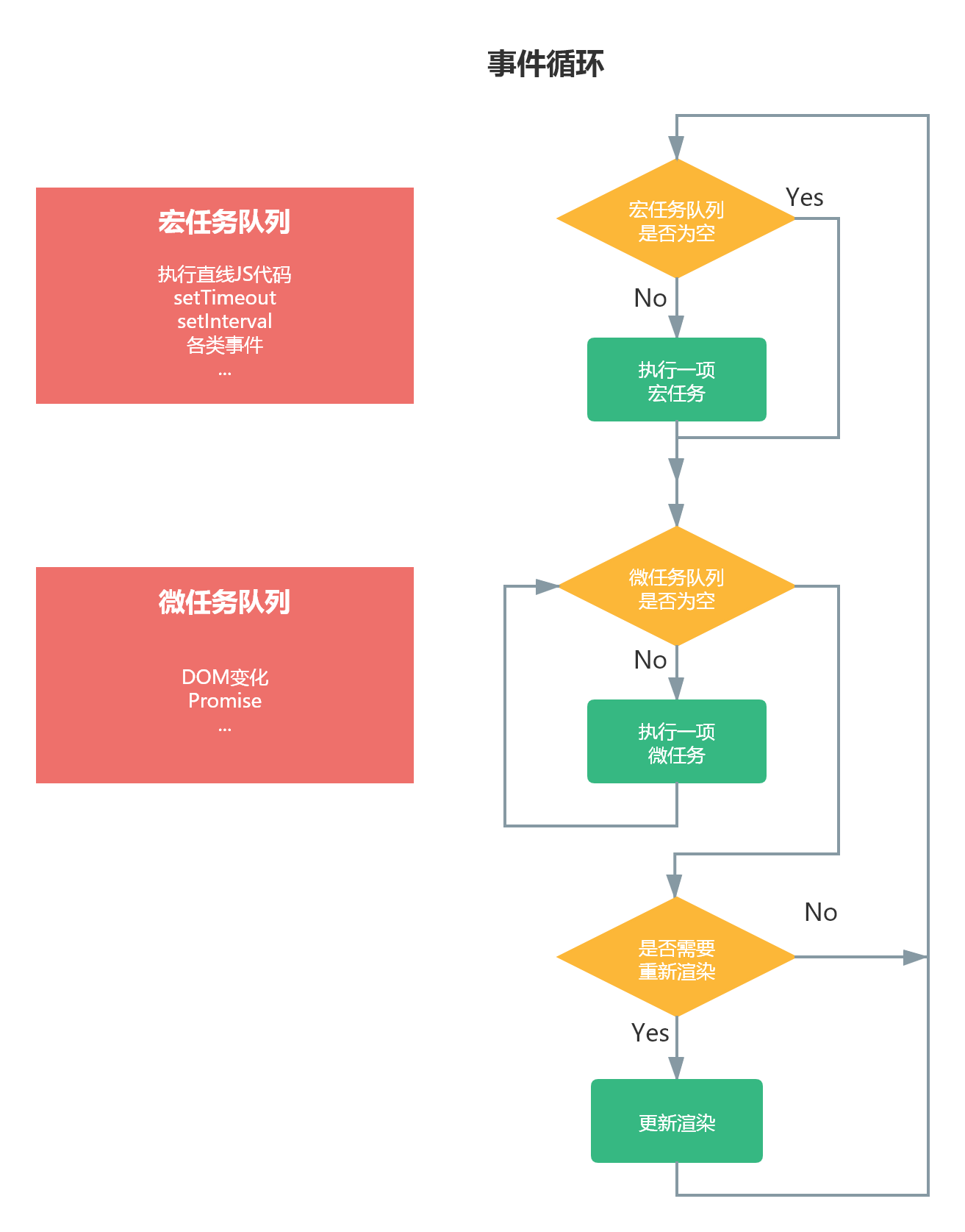JS代码在执行时基于一种循环机制,我们称这种循环机制为事件循环!事件循环的实现至少应该包含一个用于宏任务的队列和一个用于微任务的队列。大部分的实现通常会有更多用于不同类型的宏任务和微任务的队列,这使得事件循环能够根据任务类型进行优先处理。