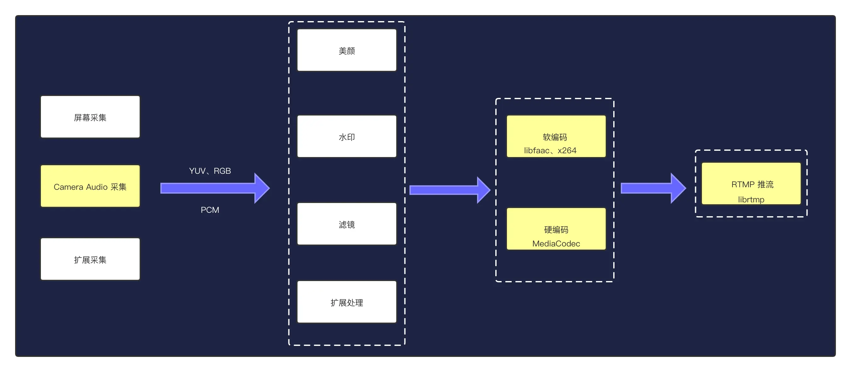 咱们回顾前面 2 篇文章,主要讲解了如何搭建 rtmp 直播服务器,和如何开发一款具有拉流功能的 Android 播放器。那么现在有了播放端和直播服务器还缺少推流端。该篇文章我们就一起来实现 Android 端的 rtmp 推流,想要实现 Android 端推流必须要经过如下几个阶段,见下图: