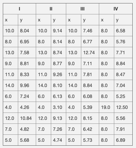 这是许多数据科学家遇到的普遍情况。示例数据是 Anscombe 的四重奏的第一组,如下表所示。这是一组人工构建的数据,当拟合直线时可以提供相同的结果,但是它们的曲线非常不同。数据文件是一个文本文件,其中的制表符用作列分隔符,前几行作为标题。该任务将仅使用第一组(即前两列)。