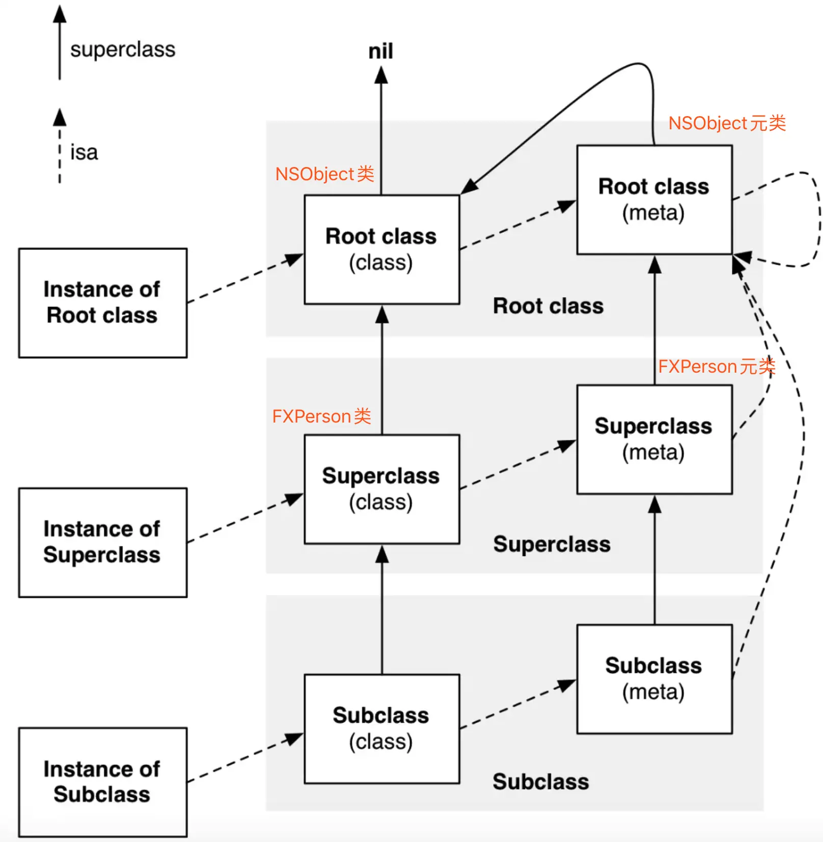 NSObject元类与NSObject类不相等,NSObject元类的父类(指向NSObject类)与NSObject类相等——YESNSObject元类与NSObject类不相等——NOFXPerson元类与FXPerson类不相等,FXPerson元类的父类与FXPerson类不相等——NOFXPerson元类与FXPerson类不相等——NO