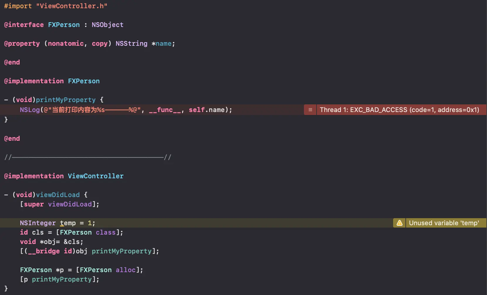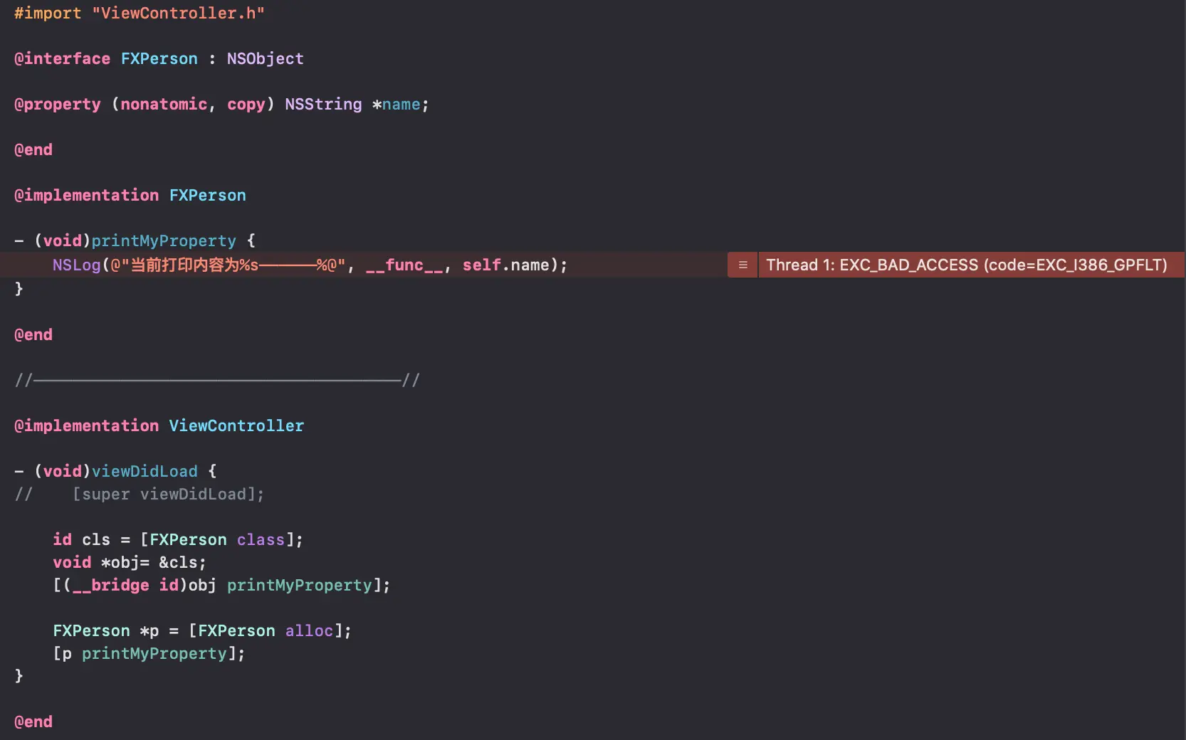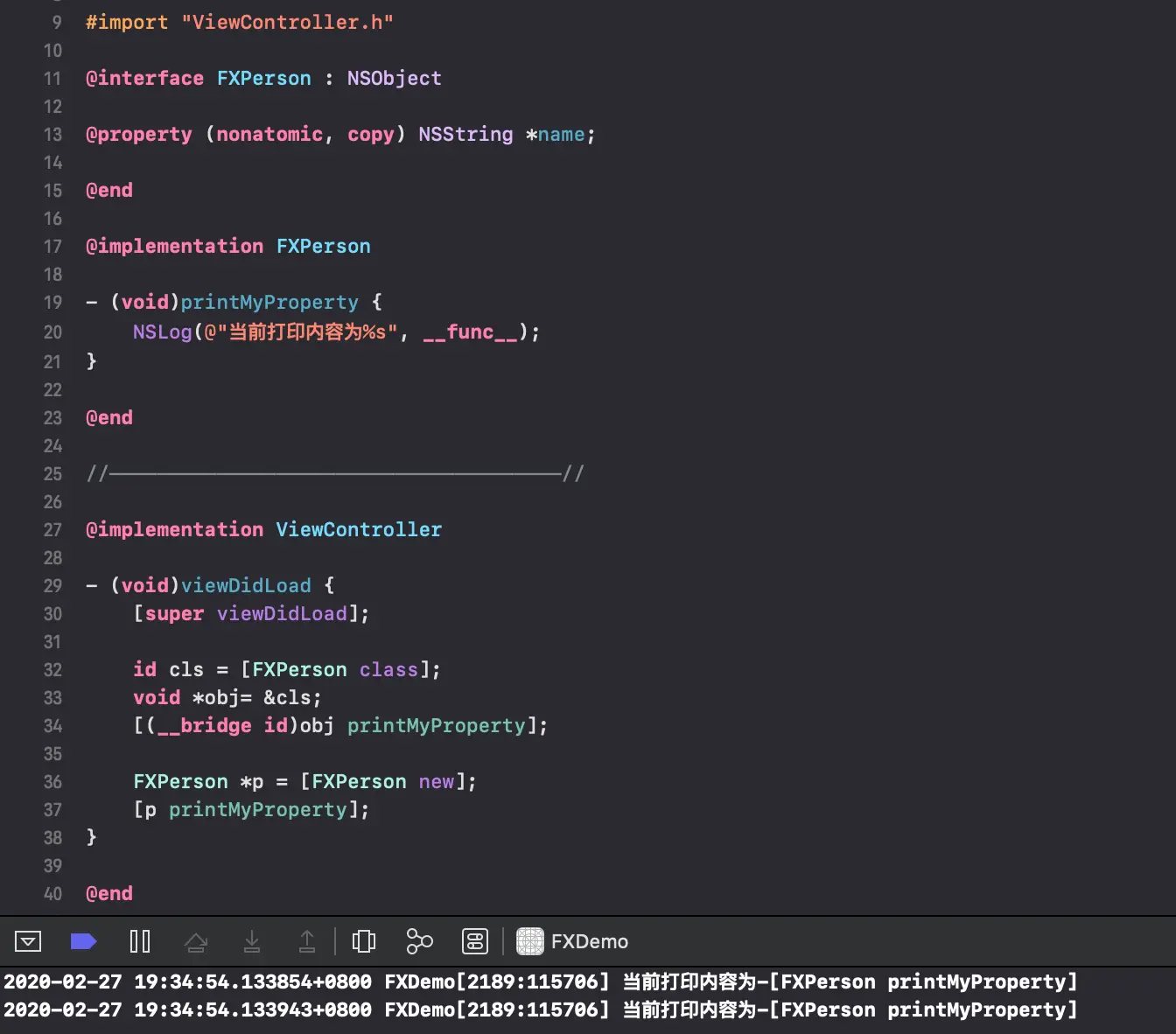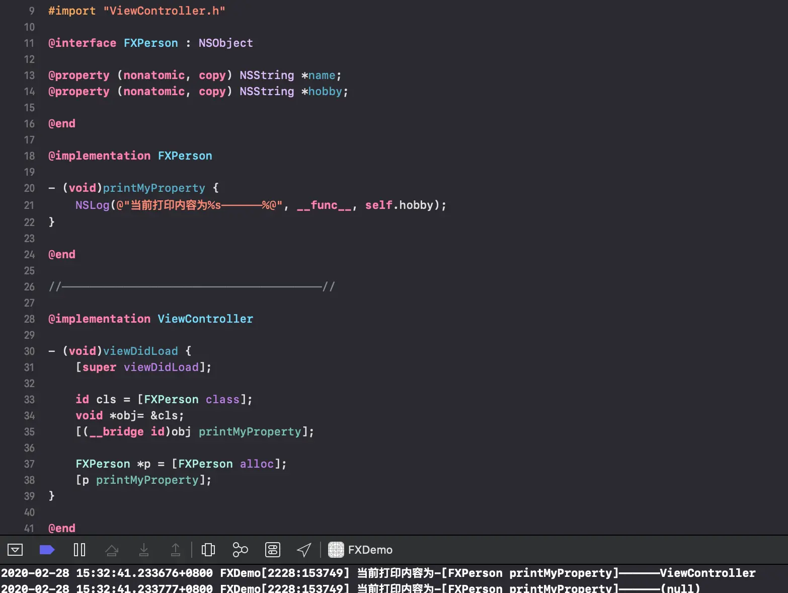 当前打印内容为-[FXPerson printMyProperty]——————<ViewController: 0x7fc72cd09450>