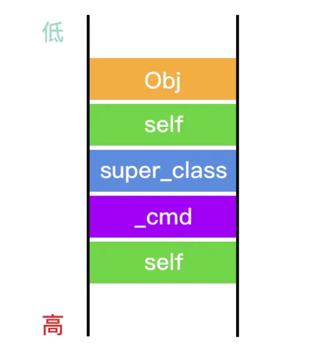 先入后出,viewDidLoad入栈先拉伸栈空间,然后依次放入self、_cmd局部变量 - 调用