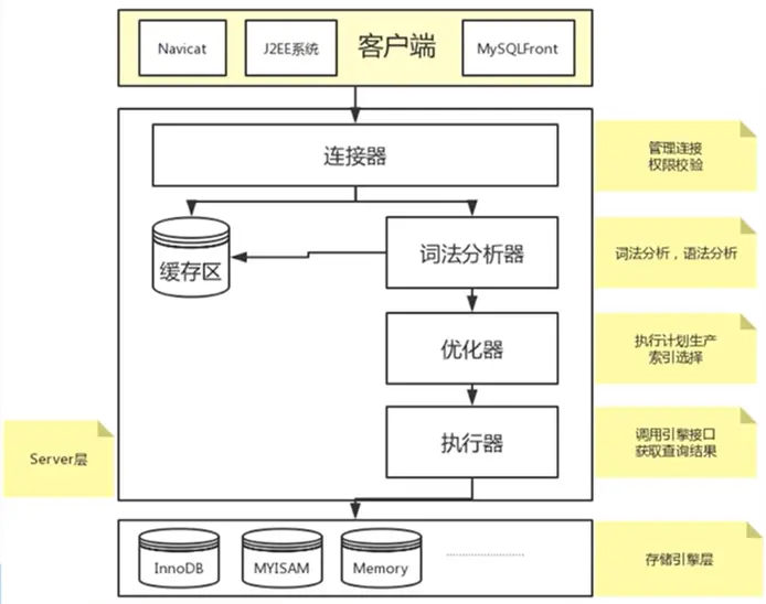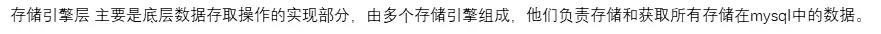 - 存储引擎层: 主要是底层数据存取操作的实现部分,由多个存储引擎组成,他们负责存储和获取所有存储在mysql中的数据。
