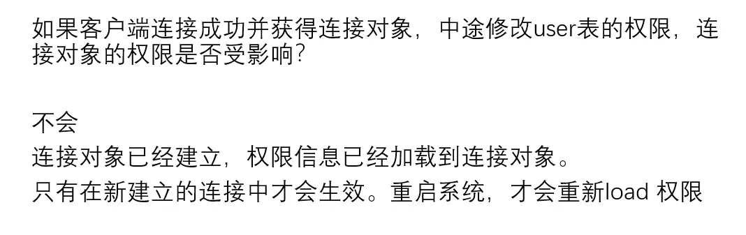 4.如果客户端连接成功并获得连接对象,中途修改user表的权限,连接对象的权限是否受影响?