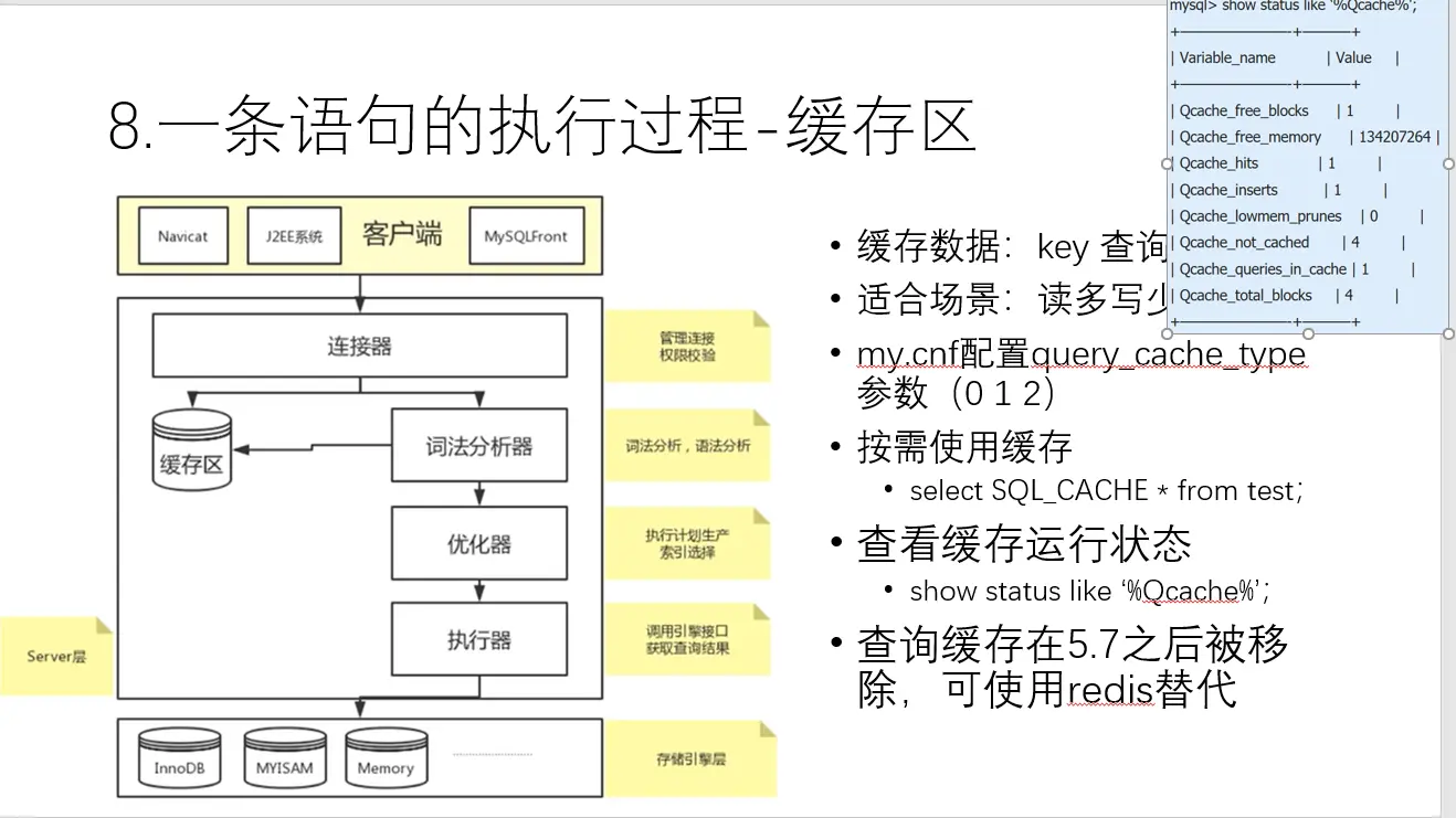 查看缓存运行状态 :比如你想执行某个查询之前,你可以查看缓存运行状态