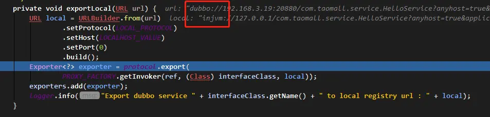 通过上面代码中,我们知道本地暴露调用的是ServiceConfig#exportLocal方法。