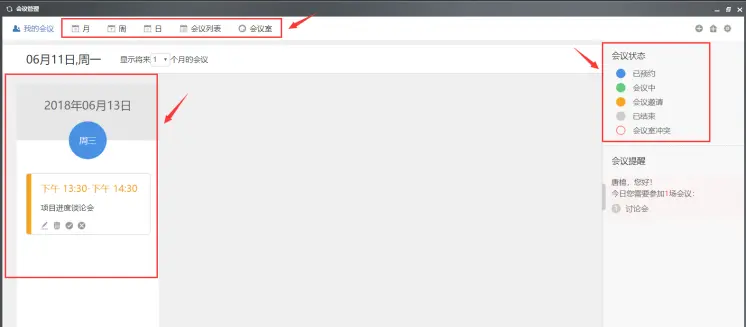 | 日 | 按日期显示今天,明天,后天要开展的会议 |