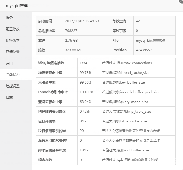 8、没有使用索引的量、没有使用索引的JOIN量 若不为0,就检查下数据表索引吧,其实只要没有疯涨,比如一天增涨几千,一般可以忽略,必竟优化索引还是程序员或DBA去干比较合适。