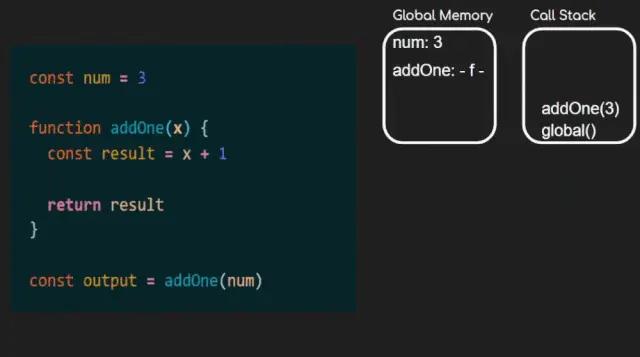 1const output = addOne(num);与上面类似,我们将标签 output 发送到内存,但还没有值,因为我们必须运行函数。