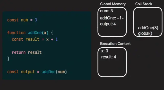 1const num = 3;23function addOne(x) {4 const result = x + 1;5 return result;6}78const output = addOne(num);上面的代码没什么让你值得兴奋的,但是可以很好地帮助我们演示执行线程。