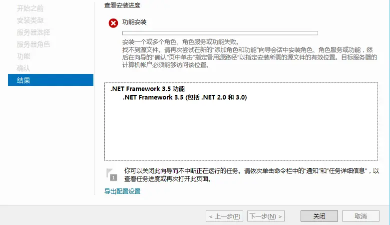 因为没有安装.net framework 3.5。 windows server 2012 R2 无法安装.net framework 3.5的问题很普遍,在网上查了下都是使用手动制定个sxs本地文件路径,配置安装。网上很难找到sxs下载资源包,csdn上都是需要积分的,又需要可以私信我。
