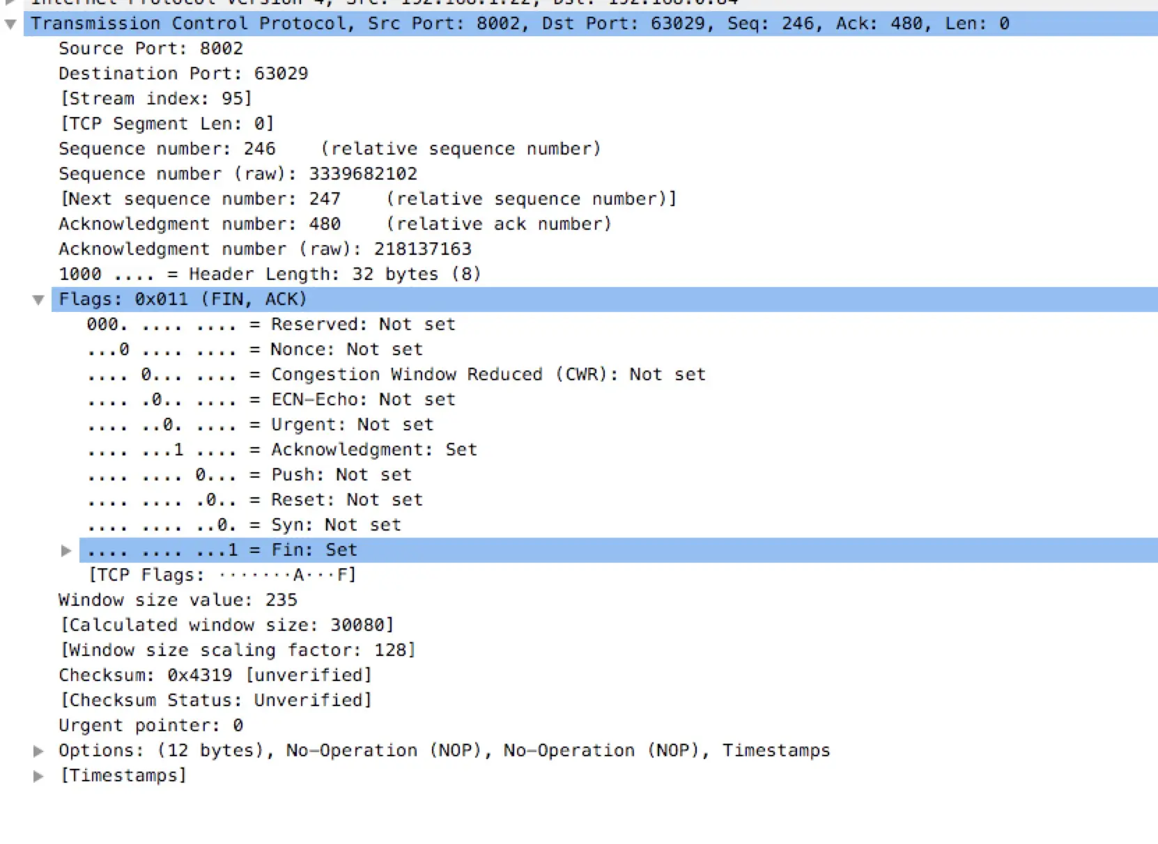 1、Server 发送 FIN = 1,ACK = 1,seq = 246,ack = 480 以及数据长度、窗口大小、最大报文段长度、客户端时间戳等 到 Client,此时Server进入 FIN_WAIT_1 状态;