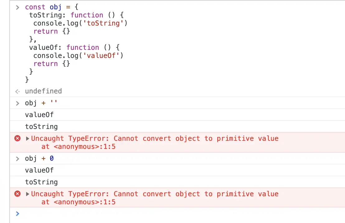 如图所示,声明一个对象,改写对象的valueOf和toString方法。可以看出,不论是将对象转换成字符串之后执行加法运算还是转换成字符串之后进行字符串拼接,obj都是先调用了valueOf方法,再调用toString方法,然后报错。