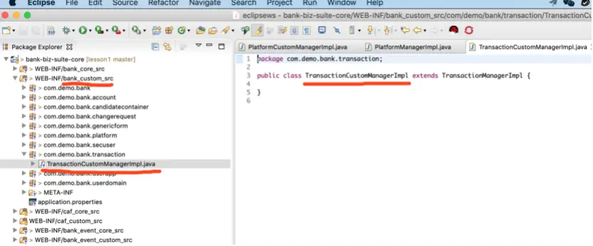 package 命名应遵循一致的规范。这里为 com.demo.bank.transaction, 和要扩展的Manager使用相同的包名