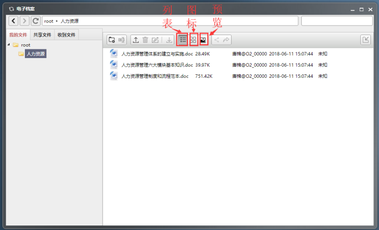 上传后的文件可以按照列表、图标、预览三种形式来查看。
