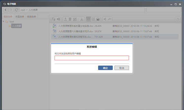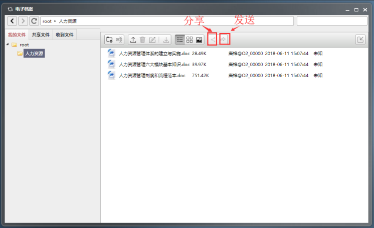 发送:如果想发送某文件给对方,您可以选中该文件并点击发送按钮,在弹出的发送编辑框里选择用户,并确定。注:发送的文件在对方收到文件夹里可查看,能被编辑。