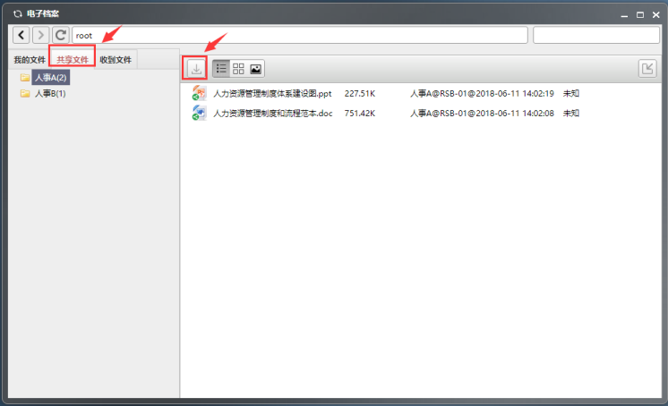 分享:如果想分享某文件给对方,您可以选中该文件并点击分享按钮,在弹出的共享文件框里选择共享用户,并确定。注:分享的文件在对方共享文件夹里可查看,只能只读不可编辑。