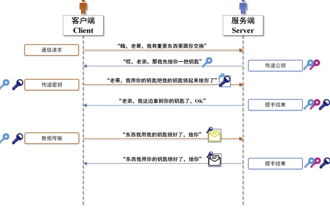 1). 首先一定要明确HTTPS既有对称加密,又有非对称加密。-\> 2).由于对称加密性能高速度快,因此在传输数据时(也就是对话内容)采用对称加密。-\>3).但是对称加密的密钥SK,既没办法预先设置(密钥不可能只有一把,服务器端维护大量密钥也不具备可行性),因此只能选择在对话前通过网络协商出一把新的SK。-\>4). 为了确保SK的传输安全,使用非对称加密来协商SK。