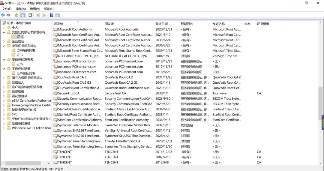 众所周知,操作系统和浏览器在软件安装阶段会在其特定目录下放置一堆的证书。如 Windows 的根证书管理在 certmgr 下: