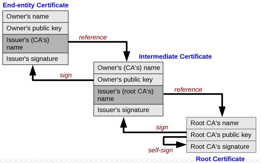 在信任链上有 3 类证书:根证书,中介证书和 用户证书。根证书前文已有说明,用户证书就是对端发过来的证书,或者说是用户向权威 CA 机构绑定了自己身份(主要指域名)和自己公钥的证书。中介证书可以理解由权威 CA 机构委派的代理机构签发的数字证书,推荐阅读《 What is an intermediate certificate?》。中介证书或者说是中介机构的存在是为了保证根证书的密钥的安全性。