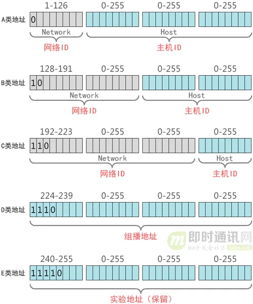 IP地址一共分为5类,即A~E,它们分类的依据是其net-id所占的字节长度以及网络号前几位。