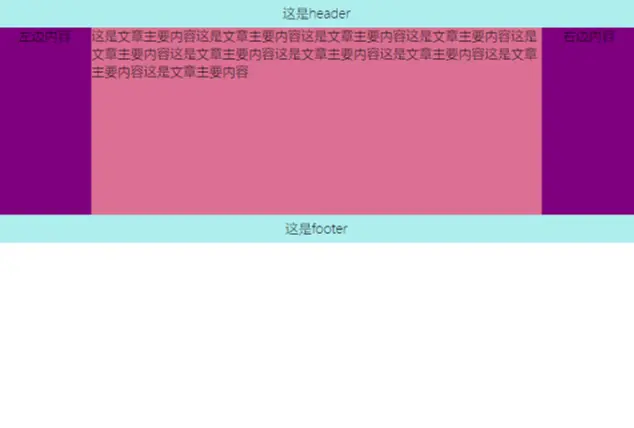 **它的原理是:**当我们为两边的侧边栏同时设置 float 时,两边的侧边栏就会脱离原来的文档流,各形成一个 BFC 且不保留原来的位置,又由于 <main> 的长度被设置为百分百,所以它会占满整个父元素长度。中间<main>容器的两边会被分别定位到左上角和右上角,分别与左边的 <aside> 和右边的 aside 发生重叠。如果这时 <main> 里面有内容,则里面的内容会受到两侧BFC的影响,将被挤到中间。这就是为什么虽然容器发生了重叠,但是内容可以看见。