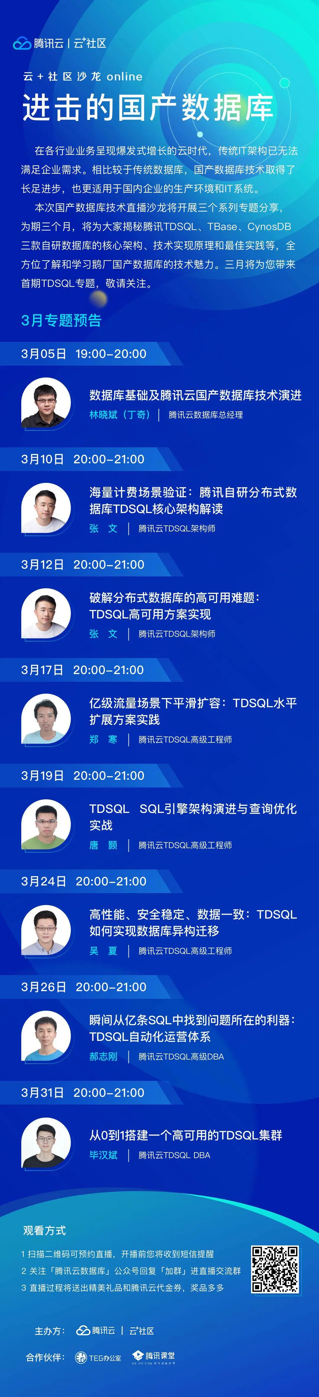 为帮助开发者更好地了解和学习国产数据库技术,腾讯云数据库特推出为期3个月的国产数据库专题线上技术沙龙,邀请数十位鹅厂资深数据库专家每周二和周四晚上在线深入解读TDSQL、TBase、CynosDB三款鹅厂自研数据库的核心架构、技术实现原理和最佳实践等。三月为TDSQL专题月,四月和五月的直播课程即将解锁……