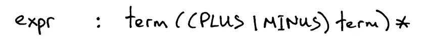 新语法的起始符号将为expr,expr的产生式将包含一个表示使用级别2的运算符主体,在本例中为加号和减号,并将包含更高级别优先级的非终结符term。 级别2: