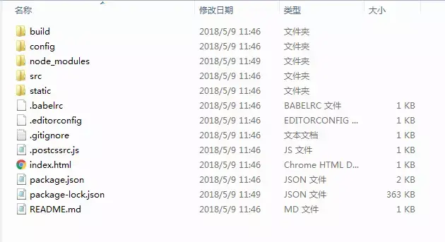 确认创建项目后,后续还需输入一下项目名称、项目描述、作者、打包方式、是否使用ESLint规范代码等等,详见上图。安装顺利执行后会,生成如下文件目录:
