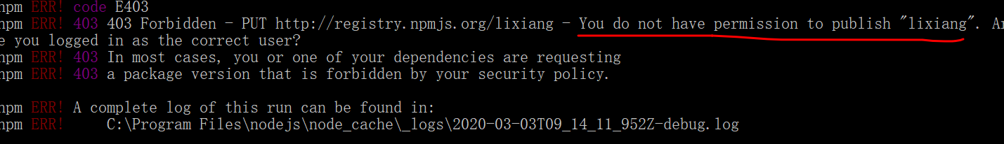 npm publish ERR! 403 发布npm包报错403 LiXiang 2020-03-03 2,242 阅读1分钟 刚开始学npm包管理,用npm publish发布包时却报错 解决办法(1)因为我是刚刚注册的npm账户,尚未确认邮箱,所以先要去邮箱确认一下,否则还会报错 (2)我的包报错原因是因为和已有包重名,更改package.json的name字段即上传成功。 出现You do not have permission to publish "lixiang". 报错原因就可能是与已有包重名。 (3)上传成功邮件: