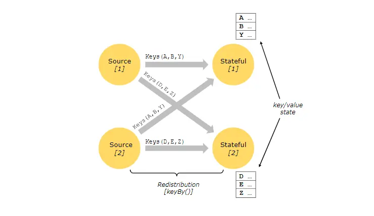 有状态操作的状态以可以被认为是嵌入式键/值存储的方式维护。严格将状态与有状态运算符读取的流一起进行分区和分发。因此,只有在keyBy()函数之后,才可以在键控流上访问键/值状态,并且仅限于与当前事件的键关联的值。对齐流键和状态键可确保所有状态更新都是本地操作,从而确保了一致性而没有事务开销。这种对齐方式还允许Flink重新分配状态并透明地调整流分区。