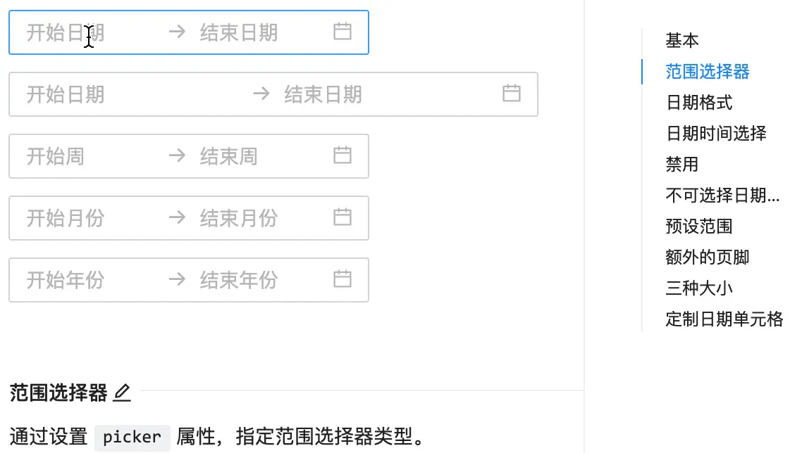 此外,我们提供了全套的时间、日期、周、月、年选择器以及对应的范围选择器。你可以通过 picker 属性进行设置,不再需要通过 mode 的受控方法来实现特地的选择器。