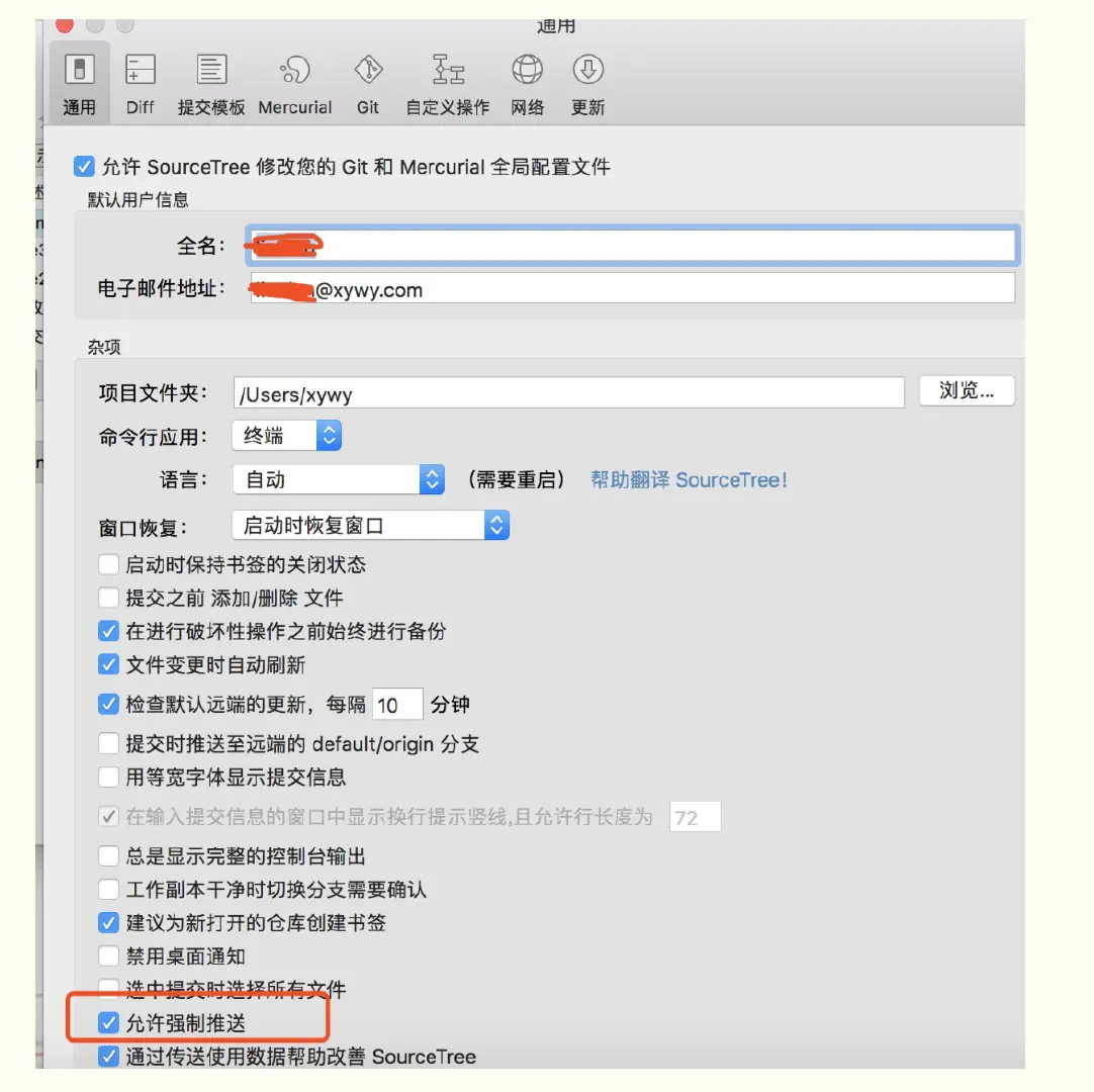 注意::在这里我建议需要的时候开启强制推送,用完就关闭(开启方法:sourceTree->偏好设置->通用->勾上“允许强制推送”)