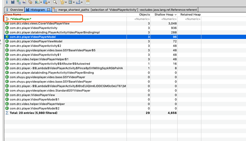 现象:反复进入A,然后退出A ,执行三次,可以看到A 的实例存在两个。如下图,VideoPlayerActivity: