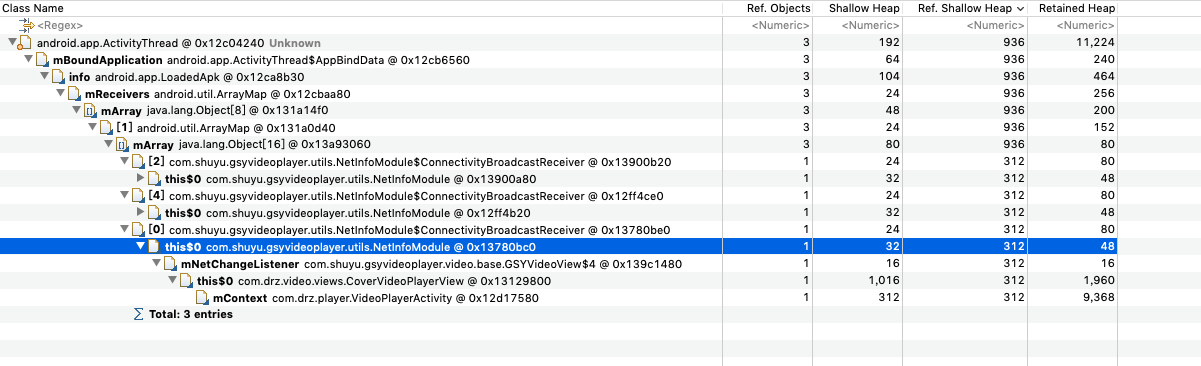 点击后,发现里面存在数据,那就说明我们有内存泄漏发生了,也就是为什么上面我们已经退出了,profile里面还有三个activity的存在,刚刚上面那张图右侧也有显示有3个activity对象存在。
