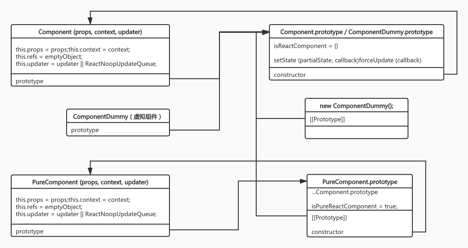 - 为了减少一次原型链查找,把 Component.prototype 在 PureComponent.prototype 上复制了一份,这样的话,Component.prototype 中的方法在 PureComponent.prototype 中都有,无需再从