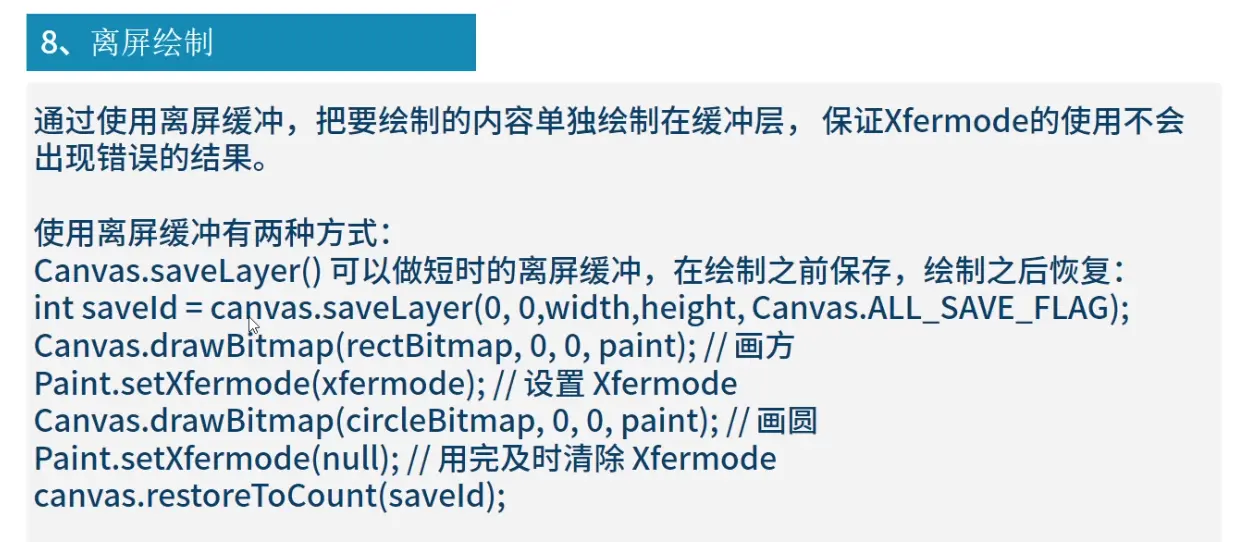 Layer栈: saveLayer的时候都会新建一个透明的图层(离屏Bitmap-离屏缓冲),并且会将saveLayer之前的一些Canvas操作延续过来 后续的绘图操作都在新建的layer上面进行 当我们调用restore 或者 restoreToCount 时 更新到对应的图层和画布上