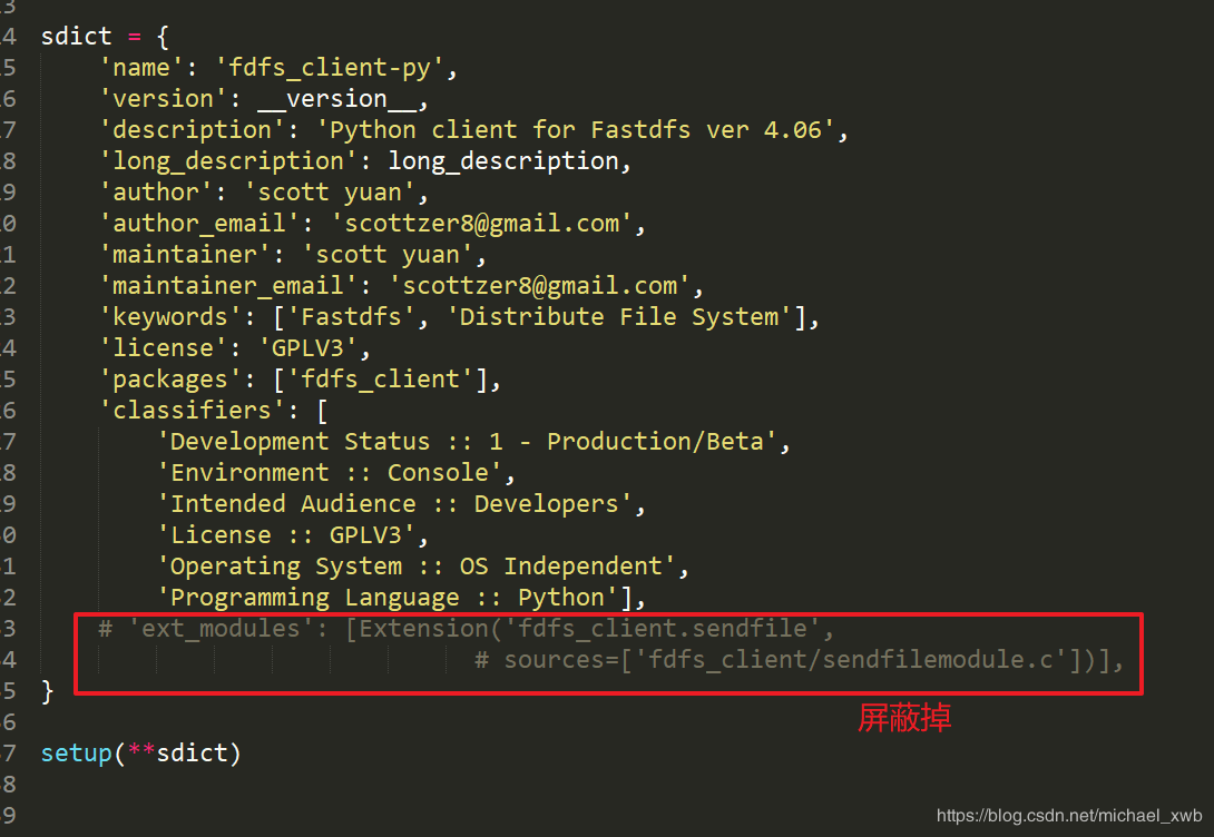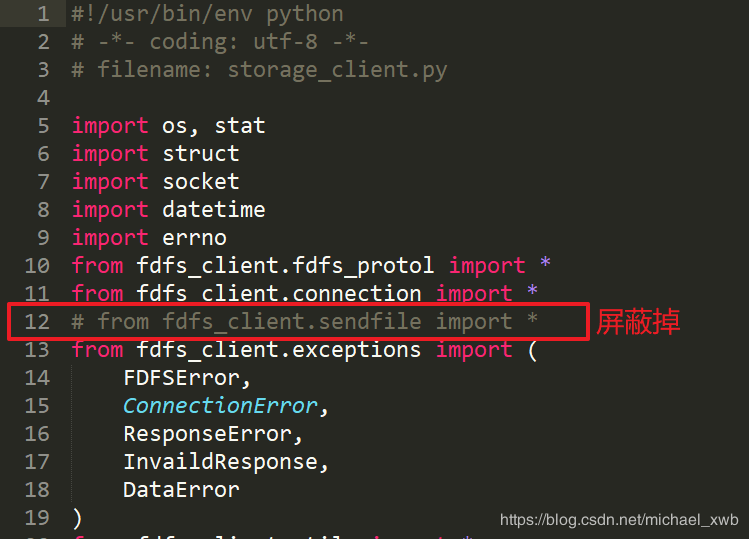 使用python客户端上传测试 1. 进入虚拟环境:workon 虚拟环境名称 2. 进入fdfs_client-py-master.zip所在目录,用下面命令安装 pip install fdfs_client-py-master.zip 注:Windows环境下安装fdfs_client-py-master.zip需要修改里面的配置 1. 修改 fdfs_client-py-master/fdfs_client 目录下的storage_client.py  3. 修改 fdfs_client-py-master 目录下的setup.py